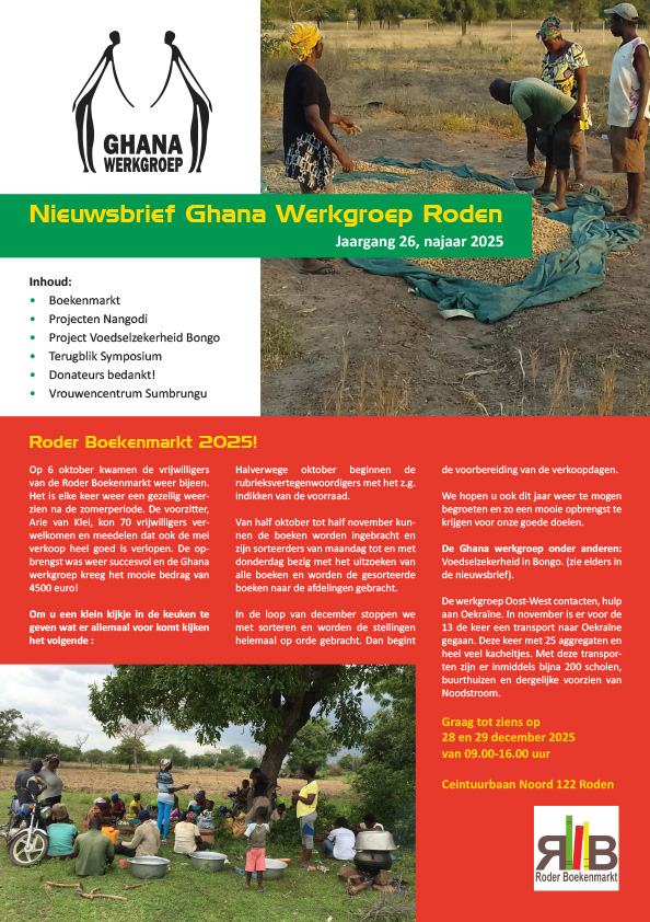 NIEUWS HOME » NIEUWS » NIEUWSBRIEF Nieuws NIEUWS SYMPOSIUM SCHRIJVERS ACTUELE PROJECTEN NIEUWSBRIEF Nieuwsbrief december 2025 Inhoud: Boekenmarkt Projecten Nangodi Project Voedselzekerheid Bongo Terugblik Symposium Donateurs bedankt! Vrouwencentrum Sumbrungu Bekijk hier de PDF versie van de nieuwsbrief ALLE NIEUWSBRIEVEN BEKIJKEN